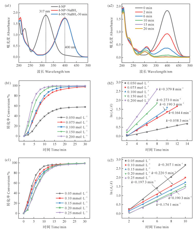 图 8(a1)为30 ℃下,4-NP及4-NP与NaBH4的混合溶液的UV-vis光谱图。4-NP溶液在波长317 nm处存在最大吸收峰;4-NP与NaBH4混合溶液的最大吸收峰出现在400 nm,归因于4-NPi的生成。30 min后,最大吸收峰值无明显变化,说明无Au-Ag NPs时,4-NP的还原反应受到动力学的限制[30],仅NaBH4不能还原4-NP。以Au0.5Ag0.5为催化剂,NaBH4浓度为0.1 mol·L-1时,4-NP催化还原反应的UV-vis光谱图如图 8(a2)所示。随着反应的进行,400 nm处的吸收峰降低,并在300 nm处出现了一个新吸收峰,说明4-NP被还原,生成了4-氨基苯酚(4-AP)。