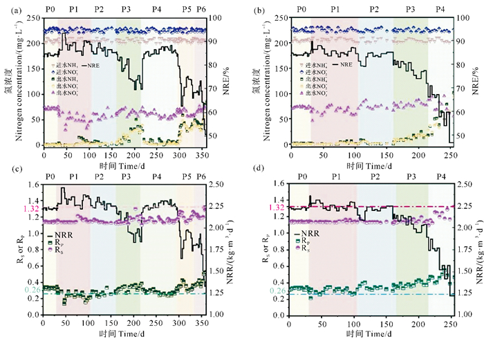 1.6 其他分析NH4+-N、NO2--N和NO3--N浓度依据标准方法[24]测定,Rs为NO2--N消耗与NH4+-N消耗的比率,Rp为NO3--N生成与NH4+-N消耗的比率,NRR和NRE的计算方法如下。血红素c的测定方法参考Barr等[25]研究。样本之间的统计差异采用SPSS 26.0中的单因素方差分析(ANOVA),显著性水平设定为p < 0.01。