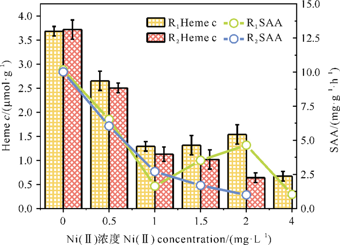 图 2 Ni(Ⅱ)胁迫下反应器中SAA和Heme c含量变化 Fig. 2 Variations of SAA and Heme c under Ni(Ⅱ) stress in different Anammox-UASB reactor |