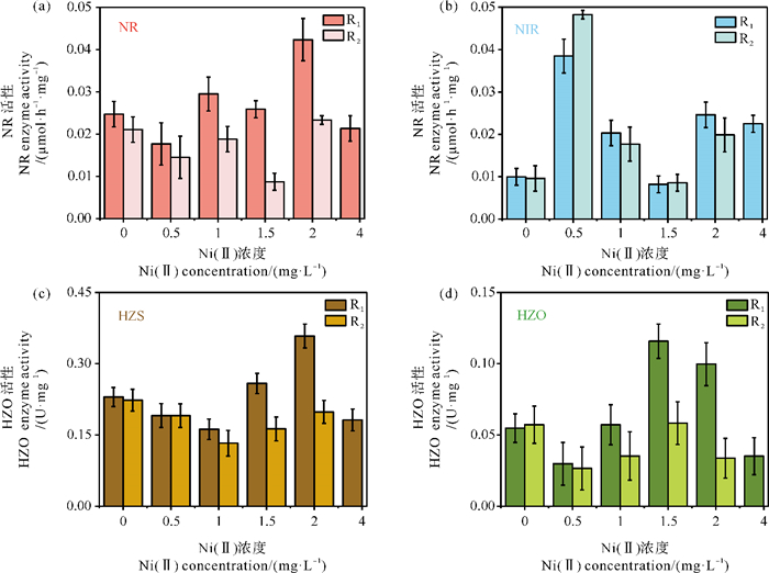 NiR催化亚硝酸盐还原为一氧化氮过程,NiR也是反硝化细菌中的一种关键酶。如图 3(b)所示,反应器R1和R2的初始NiR活性分别为(0.025±0.002)和(0.021±0.003) μmol·h-1·mg-1。0.5 mg·L-1 Ni(Ⅱ)能显著提高Anammox系统中NiR的活性,分别为(0.038±0.004)和(0.048±0.001) μmol·h-1·mg-1。Liu等[29]研究表明,甜菜碱的长期添加往往会导致反硝化细菌的快速增殖,进而NiR活性也会迅速提高。本实验中,R1的NiR活性仅略高于R2,表明在Ni(Ⅱ)胁迫下长期添加0.5 mmol·L-1甜菜碱未出现反硝化细菌与AnAOB之间的竞争,反而促进两种功能菌的脱氮合作。
