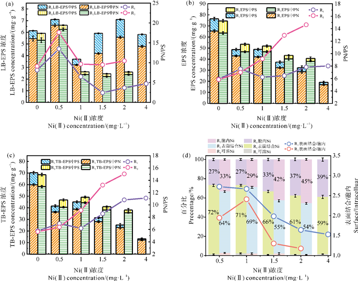 2.4.2 Ni(Ⅱ)分布通过测定不同类型Ni(Ⅱ)分布变化,可更为直观地体现Ni(Ⅱ)的吸附和内化过程。如图 4(d)所示,当Ni(Ⅱ)浓度为0.5 mg·L-1时,大部分Ni(Ⅱ)被Anammox污泥分泌的EPS吸附,以表面结合态Ni(Ⅱ)的形式存在,分别占R1和R2中Ni(Ⅱ)总量的72%和64%(p < 0.01)。随着Ni(Ⅱ)浓度的不断增加,表面结合态Ni(Ⅱ)比例的不断减少,而胞内Ni(Ⅱ)的比例不断增加。在反应器R1中,吸附态Ni(Ⅱ)的比例在P2、P3、P4和P6阶段分别为71%、66%、61%和59%,胞内态Ni(Ⅱ)的比例分别为27%、33%、37%和39%。在反应器R2中,吸附态Ni(Ⅱ)的比例在P2、P3和P4阶段分别为69%、55%和54%,胞内态Ni(Ⅱ)的比例分别为29%、42%和45%。随着反应器中Ni(Ⅱ)浓度的不断升高,EPS的吸附能力达到饱和,抵抗能力逐渐减弱,Ni(Ⅱ)穿过EPS屏障进入AnAOB内部,对细胞产生毒性作用。甜菜碱可减缓Ni(Ⅱ)的内化速度,有助于AnAOB在较高Ni(Ⅱ) 浓度胁迫下保持脱氮活性。当Ni(Ⅱ)浓度为2.0 mg·L-1时,R2中的AnAOB胞内Ni(Ⅱ)和表面结合Ni(Ⅱ)的比例分别为45%和54%。胞内Ni(Ⅱ)的比例从33%增加到45%,表明近一半的Ni(Ⅱ)通过内化作用进入了AnAOB内部(p < 0.01)。相比之下,R1中细胞内的Ni(Ⅱ)只占总量的37%。高达61%的Ni(Ⅱ)以表面结合Ni(Ⅱ)的形式存在,表明AnAOB的EPS防御系统在甜菜碱的助力下仍然发挥着重要作用,进一步证实添加甜菜碱可使AnAOB产生更多LB-EPS,从而吸附更多的Ni(Ⅱ),减缓Ni(Ⅱ)的内化过程,增强AnAOB对Ni(Ⅱ)的抵御能力。