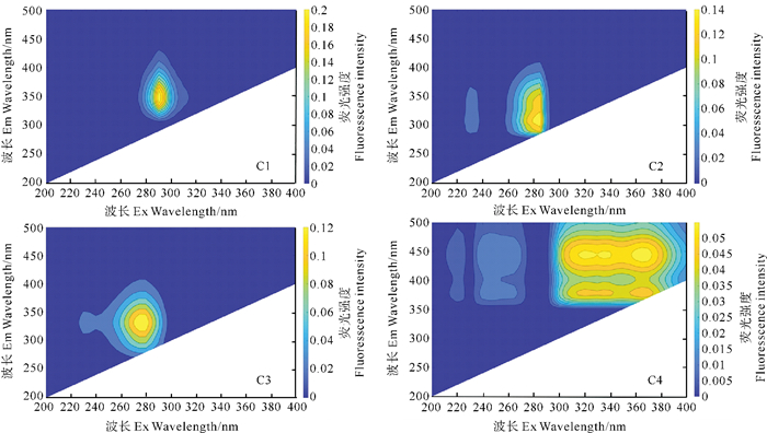 ( (a)四种成分光谱;(b)最大峰值强度。(a) Corresponding spectra of the four components; (b) Their maximum peak intensities. ) 图 6 PARAFAC模型的EEM分析 Fig. 6 EEM analysis of the PARAFAC model |