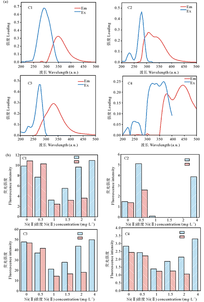 其中,如图 6(a)所示,C1(290 nm,345 nm),C1峰位于峰T附近,该组分主要由酪氨酸类物质组成,通常与外源沉积物输入和自养生产有关[36];C2(275 nm,309/343 nm),该组分与酪氨酸类和色氨酸类物质有关[37];C3(275 nm,326 nm),该组分含有色氨酸类荧光团[38];C4(360 nm,450 nm),C4峰被确定为微生物类腐殖质,与富营养化环境有关,与峰值C相似[39]。不同Ni(Ⅱ)浓度下LB-EPS中四种物质荧光强度的变化见图 6(b)。随着Ni(Ⅱ)浓度的增加,R2中三种蛋白质类物质的荧光强度显著减弱,表明在LB-EPS中蛋白质类物质在Ni(Ⅱ)的结合过程中起着关键作用。在P2至P4阶段,反应器R1相较于R2,三种蛋白质类物质的荧光强度均有回升,表明甜菜碱的添加可有效促进LB-EPS中酪氨酸和色氨酸类物质的合成。综上,Ni(Ⅱ)能够与含有酪氨酸和色氨酸的基团进行特异性结合,而甜菜碱的添加进一步促进了LB-EPS中这些物质的生成,从而增强了AnAOB对Ni(Ⅱ)毒性的耐受性。