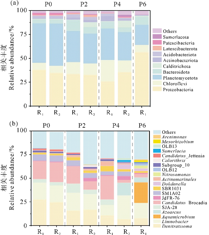 在门水平上,反应器中的优势菌门为变形菌门(Proteobacteria)、绿弯菌门(Chloroflexi)、浮霉菌门(Planctomycetota)、拟杆菌门(Bacteroidota),且其丰度在各阶段均显著高于其他菌门(见图 7(a))。其中,许多反硝化细菌和硝化细菌属于变形菌门,其存在是氮代谢过程不可或缺的一部分[40]。绿弯菌门可降解和利用细菌代谢产物,促进系统中的营养转化[41]。拟杆菌门的细菌经常出现在活性污泥中,被认为有利于污泥结构的稳定[42]。AnAOB所属的浮霉菌门的丰度与NRE密切相关[43]。