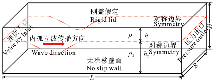 ( h1和h2分别为上、下层流体的厚度;ρ1和ρ2分别为上、下层流体的密度;L、B、H分别为数值水槽的长、宽、高;h1 and h2 represent the thickness of the upper and lower fluid layers, respectively; ρ1 and ρ2 represent the density of the upper and lower fluid layers respectively; L, B, and H represent the length, width, and height of the ISW numerical tank, respectively. ) 图 1 内孤立波数值水槽示意图 Fig. 1 Diagram of ISW numerical tank |