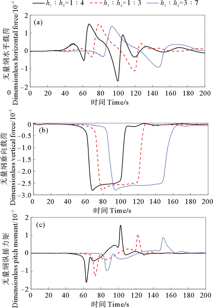 3 内孤立波作用下固定潜器载荷特性研究 3.1 潜深对内孤立波作用下潜器受力特性的影响本文以水槽深度H、位于下层流体的潜器所受重力(ρ2gV)与其恢复力矩(ρ2gVLpp)分别为长度、力与力矩的特征量,对相关物理量进行无量纲变换,具体表达式如下: