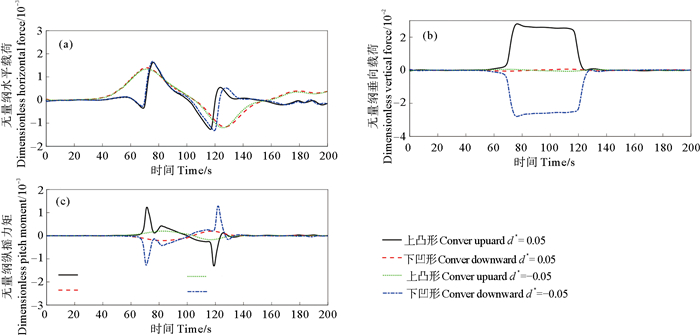 3.4 内孤立波类型对潜器受力特性的影响在实际海洋中存在上凸形与下凹形两种形态的内孤立波,为探讨内孤立波类型对固定潜器载荷的影响,将针对上凹型或下凹形内孤立波作用下不同位置处(d* = 0.05, -0.05)潜器的载荷特性进行分析。下凹形内孤立波流体分层比h1∶h2 =1∶3,内孤立波波幅$\xi_0^*$= -0.15,上凸形内孤立波流体分层比h1∶h2 =3∶1,内孤立波波幅ξ*0= 0.15。