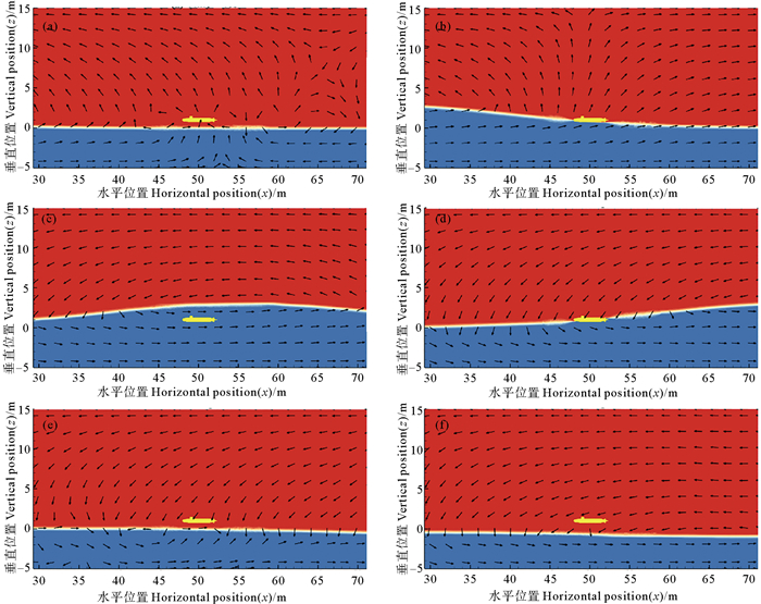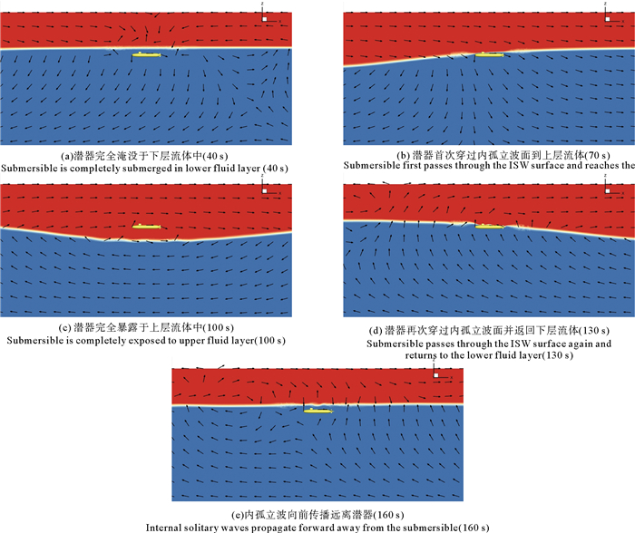 ( (a)40 s; (b)70 s; (c)100 s; (d)120 s; (e) 160 s; (f) 200 s. ) 图 12 固定潜器在上凸形内孤立波流场中的典型时刻速度矢量图 Fig. 12 Velocity vector contours for submersible in convex-ISW field at typical moments |