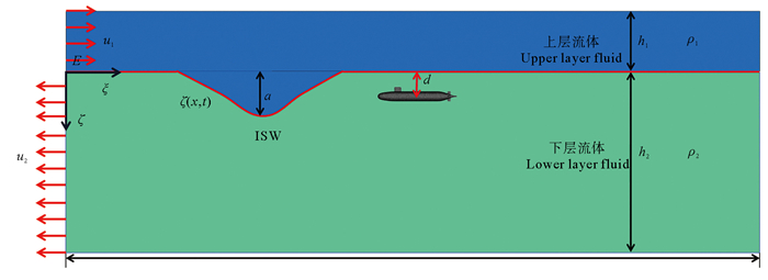 ( ISW表示内孤立波;a为内波波幅;d为潜器距离分界面的距离;u1和u2分别为上、下层流体入口边界的速度;ρ1和ρ2分别为上、下层流体的密度;E-ζξ为大地坐标系。ISW stands for Internal Solitary Wave; a represents the amplitude of the ISW; d represents the distance from the submersible to the interface; u1 and u2 represent the velocity at the inlet boundary of the upper and lower fluid layers respectively; ρ1 and ρ2 represent the density of the upper and lower fluid layers, respectively; E-ζξ denotes the geodetic coordinate system. ) 图 3 内孤立波流场中固定潜器模型示意图 Fig. 3 Schematic diagram of a fixed submersible model in the internal solitary wave field |