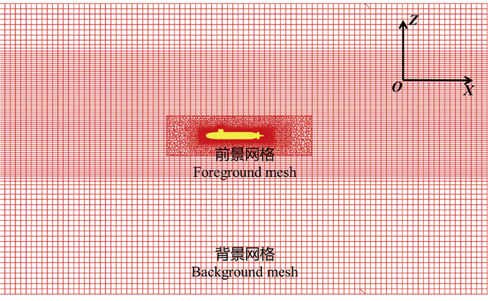 采用重叠网格技术计算潜器在内孤立波流场中的受力特性,整个计算域网格分为前景网格与背景网格两部分,二者通过构建重叠交界耦合面,采用插值的方式实现数据传递。背景网格仅用于数值造波,在波面附近进行网格的垂向加密,使局部网格尺寸为0.2 m,采用六面体结构化网格离散背景网格,背景网格单元总数量约为131万;前景网格主要用于描述潜器的受力情况,采用影响体(Body of influence,BoI)法对潜器附近的流体域进行局部加密,能够更准确地捕捉潜艇周围流场特征,采用多面体非结构化网格离散前景网格,前景网格单元总数量约为80万,两者组装后,网格单元总数量为211万,如图 4所示。