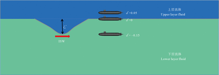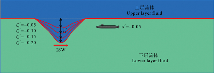 ( ISW表示内孤立波,ζ0*表示归一化的内孤立波波幅,d*表示潜器距离分界面的归一化距离。ISW stands for internal solitary wave; ζ0* denotes the normalized amplitude of the internal solitary wave, and d* denotes the normalized distance from the submersible to the interface. ) 图 5 不同潜深潜器与内孤立波相互作用示意图 Fig. 5 Diagram for a submersible in ISW field with different depths |