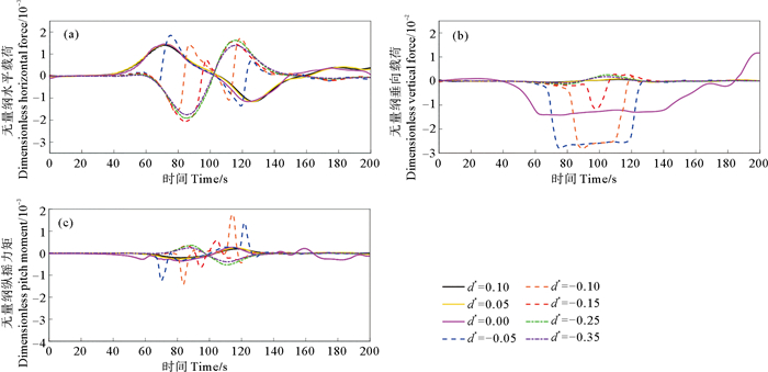 图 10展示了位于下层流体(d*= -0.05)的固定潜器在不同分层比内孤立波流场作用下的受力时历曲线。分析可知,当分层比不同时,受力曲线变化趋势基本一致:因潜器两次穿过波面,其水平载荷时历曲线存在显著的波峰与波谷各两个;随着内孤立波接近潜器来到上层流体,其垂直载荷迅速减小并维持一段时间的负幅值,待其回到下层流体后,垂直载荷增大并趋于零。无量纲纵摇力矩$M_y^*$随垂直载荷的变化而变化,其时历曲线存在显著的波峰与波谷各一个。