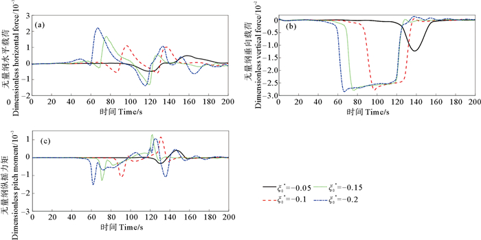 图 9展示了位于下层流体(d* = -0.05)固定潜器在不同波幅内孤立波作用下的载荷时历:无量纲水平载荷Fx*随内孤立波波幅增大而增大,且到达水平载荷幅值的时间随着内孤立波波幅的增加而提前。同样,无量纲纵摇力矩My*的负幅值也随着内孤立波波幅的增加而增大。高幅值的内孤立波($\xi_0^*$ = -0.2)诱导产生的无量纲纵摇力矩My*正幅值大于低幅值内孤立波(ξ0*=-0.05)作用下的幅值。且随着内孤立波波幅增加,内孤立波波面非线性增加,其产生的尾波序列愈加显著,尾波诱导的固定潜器载荷幅值波动也愈加明显。