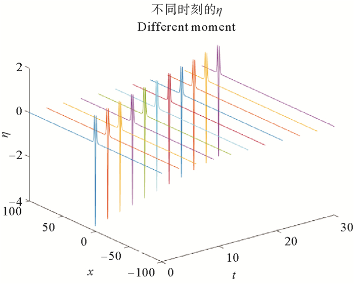 | $ \begin{array}{*{20}{c}} {\eta \left( {x,t} \right) = \frac{{15}}{4}\left( { - 2 + \cosh \left( {3\sqrt {\frac{2}{5}} \left( {x - kt - {x_0}} \right)} \right)} \right) \cdot }\\ {{\rm{sec}}{{\rm{h}}^4}\left( {\frac{{3\left( {x - kt - {x_{10}}} \right)}}{{\sqrt {10} }}} \right),}\\ {u\left( {x,t} \right) = 3k{\rm{sec}}{{\rm{h}}^2}\frac{3}{{\sqrt {10} }}\left( {x - kt - {x_0}} \right),k = \frac{5}{2}。} \end{array} $ |