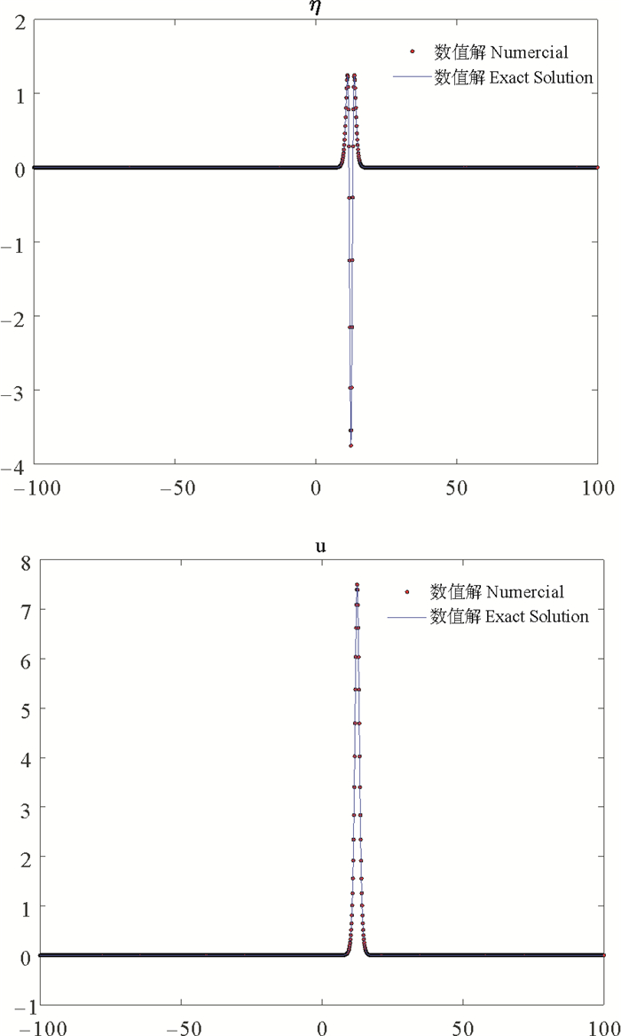 其中,η=η(x, t)表示自由水面与静止水面的距离;u=u(x, t)表示水深平均的水质点速度,x∈[-L, L]表示空间方向水质点的坐标,t≥0则表示时间变量;系数b, d的值由下述公式给出: