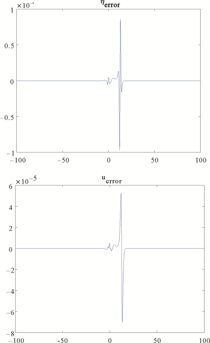 图 1展示了不同时刻的η的波形。容易看出,波形大致不变往x轴正方向移动。为验证差分格式关于时间步长的收敛阶,取空间步长h=10-4。表 3, 4分别给出了取不同τ时,η和u的数值解的L∞-范数、L2-范数误差及其收敛阶。数值结果表明,时间误差达到了二阶。图 2, 3分别给出T=5时的数值解及误差曲线。