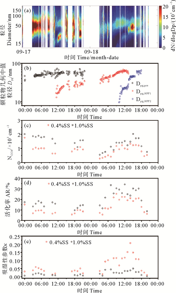 2.3 NPF事件分析在9月17与18日观测到两例NPF事件(见图 7)。将9月17日划定为NPF-1,9月18日划定为NPF-2。NPF-1事件开始于17日11:15,将该事件中颗粒物几何中值粒径定义为Dpg,NPF1,此时Dpg, NPF1约为16 nm,至18日11:30气溶胶Dpg,NPF1增长至约69 nm,直至与NPF-2中粒径谱信号混合;同时17日NPF-1事件颗粒物增长时伴随着背景颗粒物增长。根据图 7(b)可知,前体背景颗粒物初始观测几何中值粒径值(Dpg, pre)约为35 nm,增长至夜间21:30达到62 nm左右,并逐渐与NPF-1事件增长颗粒物发生混合。NPF-2事件开始于18日09:55左右,颗粒物几何中值粒径(Dpg, NPF2)约为9.7 nm,并在18:00到达66 nm,逐渐与NPF-1发生混合。在17日与18日,NCN均值分别为(11±1.8)×103 cm-3、(5.2±1.3)×103 cm-3,与全程观测时段内NCN均值相比均有所增加,其中NPF-1数浓度增长较为明显,与全程均值相比增加约一个数量级。在17日NCCN0.4与NCCN1.0均值分别为(0.98±0.27)×103 cm-3和(1.7±0.26)×103 cm-3,NCCN变化率为73%,AR0.4与AR1.0均值分别为(8.7±2.3)%、(15±2.4)%,约为全程对应过饱和度下AR值的0.6倍;18日NCCN0.4与NCCN1.0均值分别为(0.82±0.36)×103 cm-3和(1.2±0.41)×103 cm-3,变化率仅有46%,远小于17日NCCN增长变化量,但相应过饱和度下AR值增加,分别为(16±6.3)% (AR0.4)、(25±7.4)%(AR1.0),与全程对应过饱和度下AR值相似。现有观测研究表明,60 nm以上的颗粒物(NCN>60 nm)对活化为CCN有一定的贡献作用[12, 28, 29],当NPF与前体物混合增长时,生成的二次颗粒物对CCN的活化有明显的贡献[30-31],由于17日NPF-1伴随前体物增长,满足大于60 nm的NCN相对较多,不同过饱和度下的NCCN差值增长较为明显,而18日NPF-1与NPF-2增长至60 nm以上粒径的NCN有限,对于活化为CCN贡献相对较弱,NCCN差值变化较小。