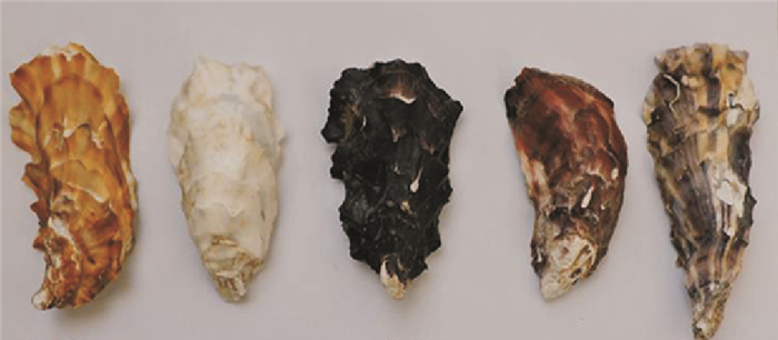 图 1 金壳色、白壳色、黑壳色、紫壳色及普通养殖长牡蛎 Fig. 1 The Crassostreagigas with golden, white, black, purple and ordinaryshell colors |