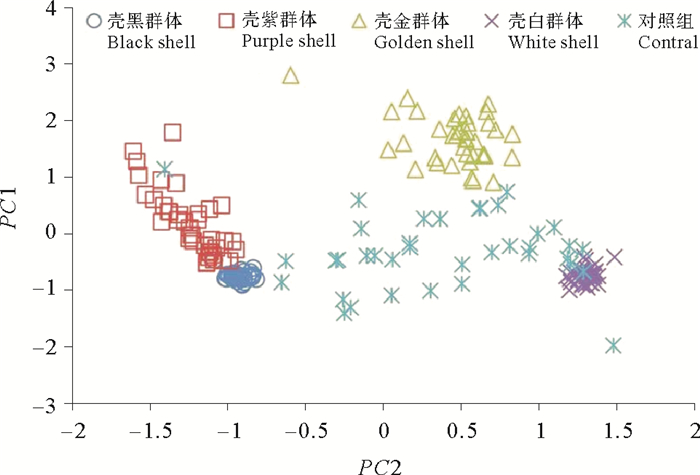 基于PC1和PC2两个主成分的散点图显示了4种壳色群体的散点分布与对照群体明显不同。金壳、黑壳、白壳与紫壳群体散点分布均较为集中,对照群体散点分布分散;紫壳与金壳群体散点较黑壳与白壳群体分散(见图 2)。
