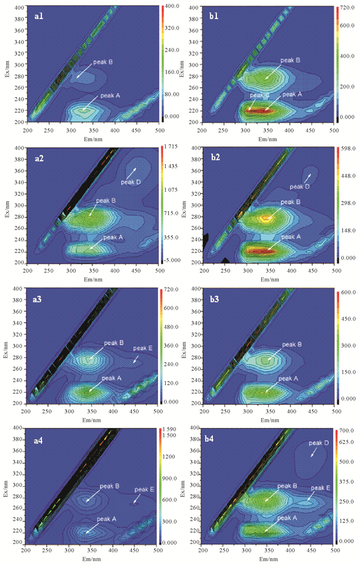 ((a1)LB-EPS(0 mg/L); (b1)TB-EPS(0 mg/L); (a2)LB-EPS(5 mg/L); (b2)TB-EPS(5 mg/L); (a3)LB-EPS(10 mg/L); (b1)TB-EPS(10 mg/L); (a4)LB-EPS(60 mg/L); (b4)TB-EPS(60 mg/L).) 图 3 不同TiO2 NPs浓度下LB-EPS (a1~a4)和TB-EPS (b1~b4)三维荧光光谱 Fig. 3 3D-EEM fluorescence spectra of LB-EPS (a1~a4) and TB-EPS (b1~b4) at different TiO2 NPs concentrations |