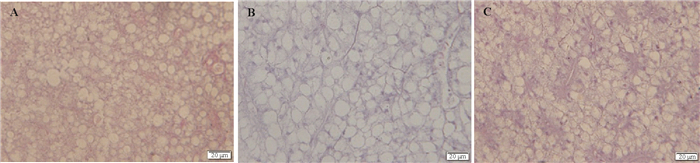 (A:高温胁迫组(27 ℃),B:对照组(16 ℃),C:低温胁迫组(5 ℃)(×400)。比例尺=20μm。A: Thermal treatment (27 ℃). B: Control treatment (16 ℃). C: Cold treatment (5 ℃(×400)). Scale=20μm.) 图 1 不同温度胁迫下许氏平鲉肝脏组织学变化 Fig. 1 Histological changes under different temperature challenges in liver of black rockfish |