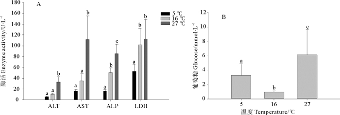 2.3 急性温度胁迫对许氏平鲉血清指标的影响由图 2A可知,在高温胁迫下许氏平鲉血清中ALT、AST和ALP的水平分别由16 ℃时的11.54、34.92和46.16 U/L上升到27 ℃时的33.30、112.03和85.84 U/L,且差异显著(P<0.05)。LDH变化并不显著。在低温胁迫下,ALP和LDH的水平显著下降(P<0.05),分别由16 ℃时的46.16和102.38 U/L下降到5 ℃时的15.62和52.58 U/L。而ALT和AST的水平与对照组相比有所下降,但并不显著。急性温度胁迫下许氏平鲉血清中GLU的水平在低温和高温胁迫下均显著上升(P<0.05),由16 ℃时0.97 mmol/L分别上升到5 ℃时3.29 mmol/L、27 ℃时6.14 mmol/L,并且高温胁迫比低温胁迫的GLU水平上升较显著(见图 2B)。