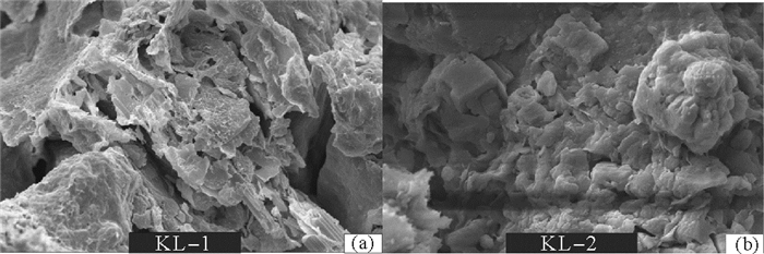 ((a)长石溶蚀,粒间胶结物为丝片状伊/蒙混层;(b)粒间孔隙内充填白云石、次生加大石英和丝片状伊利石。(a)The feldspar is dissolved, and the intergranular cement is a filament-like I/matter mixed layer; (b)Intergranular pores filled with dolomite, secondary enlarged quartz and filament illite.) 图 1 KL油田混积岩陆源碎屑岩扫描电镜照片 Fig. 1 Scanning electron micrograph of terrigenous clastic rocks of mixed rock in KL oilfield |