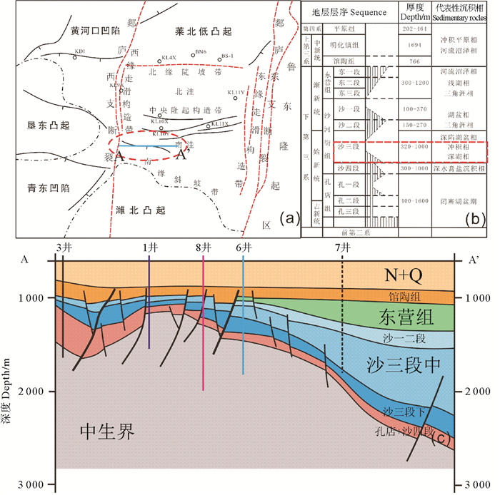 1 地质背景区域上,研究区位于渤海南部海域莱州湾凹陷南部宽缓斜坡带高部位(见图 2),北侧紧邻莱州湾凹陷北洼,东侧紧邻莱州湾凹陷南次洼,是北洼和南次洼油气运聚的有利区带。研究区范围内钻井揭示的地层自上而下为第四系平原组、新近系明化镇组和馆陶组、古近系东营组和沙河街组以及中生界(未穿)[9-10]。钻井揭示的含油层位有新近系馆陶组和古近系沙三上段、沙三中段、沙三下亚段、沙四段以及中生界,其中馆陶组和沙三下亚段为本油田的主要含油层位。根据区域构造演化认识,油田范围内古近系地层早期(沙四段~沙三下亚段沉积时期)受控于潜山古地貌,地势呈东高西低;中期(沙三中段~东营组沉积时期)受构造反转影响,构造格局演变为西高东低,自西向东地层逐渐变厚;晚期(东营组沉积末期)受区域抬升影响地层遭受剥蚀[11-13],油田范围内东一段地层整体缺失。沙三下亚段主要发育辫状河三角洲相,滨浅湖相以及扇三角洲相沉积。