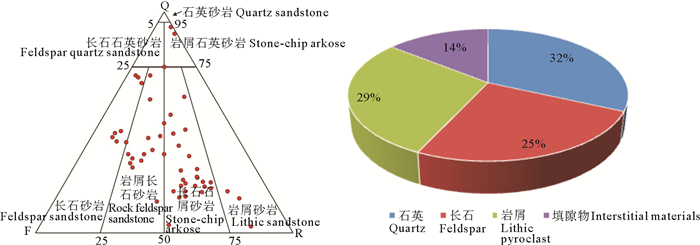 图 3 砂岩成分三端元组分图及碎屑颗粒百分含量统计图 Fig. 3 Sandstone composition three-terminal component map and crumb particle percentage content statistics |
