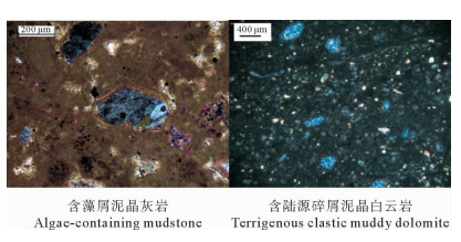 根据混积岩分类命名方案[5],可以看出研究区混积岩主要类型为陆源碎屑质碳酸盐混积岩和碳酸盐质陆源碎屑混积岩(见图 4)。其中,陆源碎屑为火成岩岩块、长石和石英;碳酸盐主要呈泥晶状,I油组发育部分生物碎屑和鲕粒,鲕粒类型复杂,形状不一,核心多为陆源碎屑。岩石成分主要为方解石(45%)、泥质(25%)和陆源碎屑(30%)组成,方解石呈泥晶状,泥质与方解石混杂分布,陆源碎屑主要见花岗岩岩块,以及少量石英、长石和流纹岩岩块,部分泥质有向鳞片状伊利石转化的现象。总体来说,研究区岩性变化复杂,储层非均质性强。