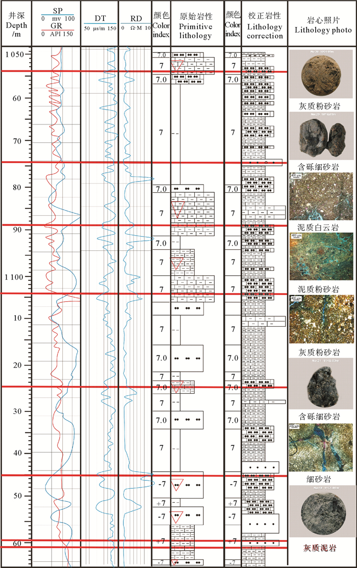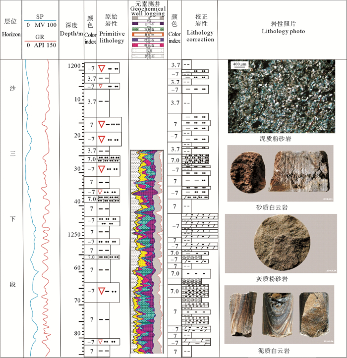 由于研究区沙三下亚段岩性极为复杂,取心井只有两口,仅仅依靠壁心、薄片对研究区沙三下亚段的岩心识别具有很大的难度,因此在常规岩性识别的基础上运用元素测井对研究区岩性进行了识别和校正。地层元素测井测量得到地层岩石骨架的Si、Ca、Fe、S、Ti、Gd、Mg、K、Mn、Al等10余种元素的含量主要用于确定矿物含量和识别岩性[1, 12]。在研究区取心井原始岩性识别的基础上,结合壁心照片、薄片照片、元素测井资料,对岩性进行校正,可以发现1 243~1 280 m井段,从元素测井上可以看出白云质较为发育,从岩心照片上也可以看出主要为砂质白云岩,因此将岩性从砂岩校正为砂质白云岩。从1 256~1 280 m井段,方解石较为发育,因此将该井段岩性校正为灰质粉砂岩,通过岩心照片验证可知,校正后得到的岩性更符合研究区沙三下亚段实际情况的岩性(见图 5)。