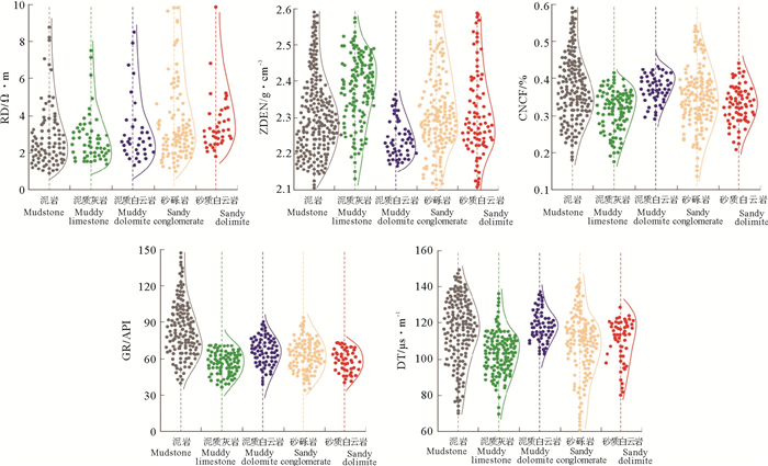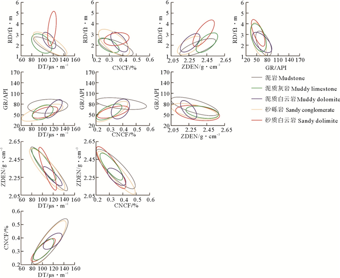 首先利用研究区不同类型混积岩岩性的测井参数特征对不同岩性进行测井参数敏感性分析(见图 6)。将泥岩、泥质灰岩、泥质白云岩、砂砾岩、砂质白云岩五种岩性测井参数概率密度分别投到5条测井曲线上,可以看出各种不同岩性所对应的测井响应参数大致分布范围,从得到的测井参数概率密度分布图可以看出,GR曲线对泥岩反应较为敏感多大于70API,但对混积岩反映不太敏感,ZDEN对灰岩的反映较为敏感而DT则对白云岩反映较为敏感。从图中可知通过测井参数概率密度分布特征可以将泥岩、灰岩和白云岩加以区分,而灰质白云岩和白云质灰岩、泥质灰岩和泥质白云岩这几种类型的混积岩则无法用单一的测井参数概率密度分布特征来加以区分。因此,在此5种测井参数中又任选了2种测井参数绘制出散点图矩阵,并对该散点矩阵进行进一步的分析得到其二维作伴及协方差矩阵,最后得到这两种曲线的二维测井参数90%置信度的置信椭圆,用以表征二维测井参数概率密度分布特征。
