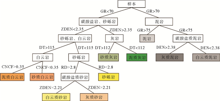 为了得到复杂混积岩的岩性分类模型,在测井参数概率密度分布特征及二维测井参数90%置信度的置信椭圆筛选结果的基础上运用决策树方法将研究区的所有测井参数数据进行汇总,建立不同岩性的测井参数样本集,针对各类岩性随机抽取200个测井参数样本,得到样本参数集。综合分析测井参数概率密度分布特征,选择声波时差(DT)、自然伽马(GR)、密度(ZDEN)、深侧向电阻率(RD)和补偿中子(CNCF)5种测井参数进行岩性分类、识别。通过对样本集的筛选测试最终得到所需的数据集,再依据决策树方法逐步建立可以识别复杂混积岩的岩性分类器(见图 8)。