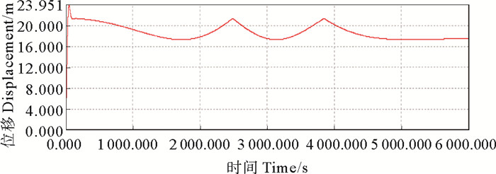 Aqwa模块忽略了水流作用对构筑物产生的涡激振动,因此无法准确模拟出构筑物在涡激振动下的振动响应。构筑物在单索单点系泊方式下的运动响应如图 11所示,可以看出构筑物的运动周期非常长,这与实际情况明显不符合,但Aqwa模块能够较为准确的模拟出构筑物在不同方向上的平均位移。本文的研究目的是比较不同系泊方式对构筑物在水中稳定性的影响,因此Aqwa模块能够满足研究要求。