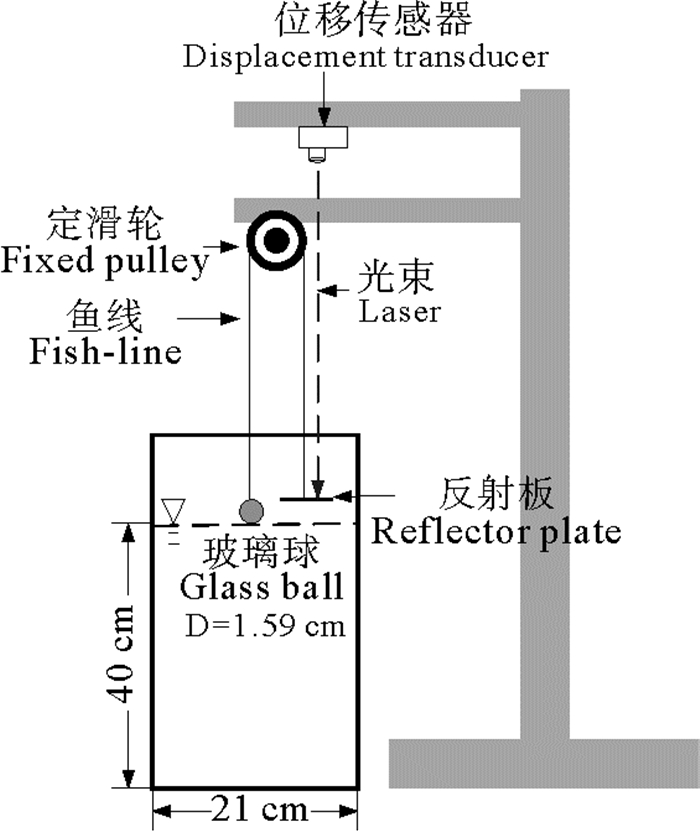 1.1 试验仪器与样品流变测试试验中所用仪器为R/S+流变仪(Brookfield工程实验室公司生产),使用同轴转子测试(型号为MK3-CC40-DIN)。落球法试验中所用玻璃小球直径1.59 cm,质量5.20 g,表面光滑。玻璃球通过高强度的鱼线与反射板相连挂于滑轮上。反射板为直径2 cm的白纸片,用于激光测距仪的光反射。SICK激光位移传感器(型号为DX35,精度1‰)连接到DEWSoft瞬态数据采集仪(型号为DEWE-43,精度1‰),以100 Hz频率采集位移信息。落球法装置见图 1。试验中所用浑水体均由高岭土和清水配成,样品温度为14 ℃,所用高岭土平均粒径约为3.7 μm,属黏土。
