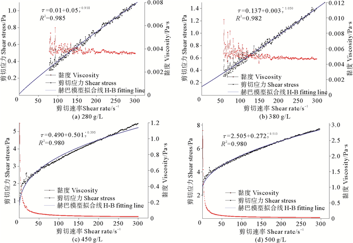 根据流变试验结果,绘制剪切速率-剪切应力和剪切速率-黏度的关系曲线,图 2给出浓度280、380、450、500 g/L的浑水样品的测试结果。