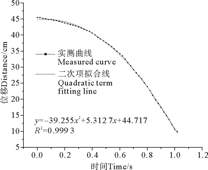 在玻璃球自由下落的空白试验中,对其位移和时间数据作图后进行二次项拟合(见图 3),其相关系数为0.999 3,可以视为匀加速直线运动,阻力在其下落过程中基本稳定,加速度约为78.81 cm/s2。
