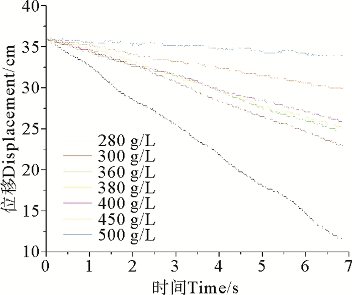 1.2.2 落球法试验配制与流变试验中相同浓度的样品,每个浓度的样品配制一次,通过三次测量来完成平行组的试验,每次测量前充分搅拌,静置10 s左右,水体稳定下来后立刻释放小球进行测量。小球自样品液面处由静止释放,用激光位移传感器与瞬态数据采集仪记录小球的位移与时间,传感器频率为100 Hz,在不同浓度组浑水样品落球试验前,先使小球和反射板系统在滑轮上自由下落,测得加速度,用以计算反射板、滑轮等在小球下落过程中产生的阻力。通过其位移与时间图像,计算得到小球在浑水样品中匀速沉降段的速度,进而计算得到各浓度组样品的黏度,黏度计算公式为: