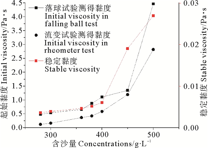 将浑水体利用落球法试验和流变仪试验得到的黏度整理在表 1中。落球法试验所得黏度与流变仪测得的起始黏度量级相同,且随含沙量变化的趋势相同,但是与流变仪试验得到的稳定黏度差距较大,相差达两个数量级。且当浓度超过400 g/L时,黏度增幅显著变大。