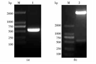| 图 1 SoHb基因的RT-PCR扩增(a)及pET32a-SoHb重组质粒酶切鉴定(b) Fig. 1 RT-PCR amplification analysis of SoHb of spinach (a) and restrict enzyme analysis of pET32a-SoHb plasmid (b) M: Marker; 1: The PCR product of SoHb; 2: The restrict enzyme analysis product of pET32a-SoHb |