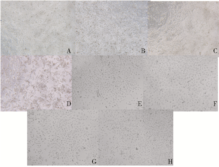 | 图 3 观察96孔板细胞(×100) A 为HepG2细胞加GCV 0μg;B 为HepG2细胞加GCV 80μg;C 为转染的HepG2细胞加GCV 0μg;D为转染的HepG2细胞加GCV 80μg;E 为L-02细胞加GCV 0μg;F 为L-02细胞加GCV 80μg;G为转染的L-02细胞加GCV 0μg;H 为转染的L-02细胞加GCV 80μg Fig. 3 Observe the cells in 96-well plates(×100) |