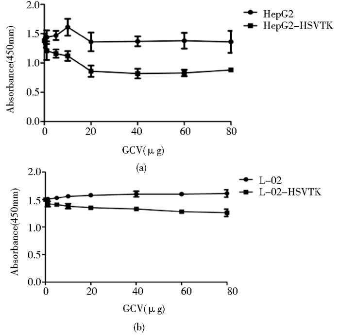 不同浓度的GCV作用于HepG2细胞后,HepG2有明显的凋亡,呈现明显的剂量和时间依赖关系:随着GCV浓度的增高,作用时间的延长,细胞存活率逐渐下降。同时不同浓度的GCV作用于HL7702细胞后,细胞有微弱的凋亡,但总体生长平缓。图 4为加入不同浓度GCV后,CCK8法所测450nm处的吸光度值。