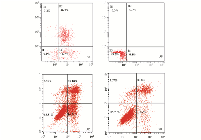 | 图 5 流式细胞仪检测细胞凋亡率 A为转染的HepG2细胞的凋亡流式图;B为 HepG2细胞的凋亡流式图;C为转染的L-02细胞的凋亡流式图;D为L-02细胞的凋亡流式图 Fig. 5 Cell apoptosis rate detection with Flow Cytometry |