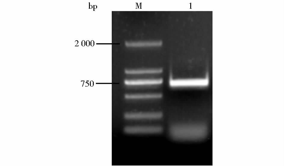 2 结果分析 2.1 鼠Prdx6基因扩增及表达载体构建从小鼠巨噬细胞系RAW264.7中提取的RNA进行反转录后获得cDNA,以cDNA为模板对Prdx6基因进行PCR扩增,得到一条略小于750bp的条带,产物用1%琼脂糖凝胶电泳进行检测(图 1),切胶回收进行纯化。胶回收产物与PET-28a质粒同时进行双酶切,连接后构建重组表达载体,酶切进行鉴定(图 2)。重组质粒测序验证,序列正确。