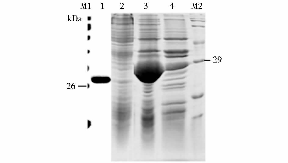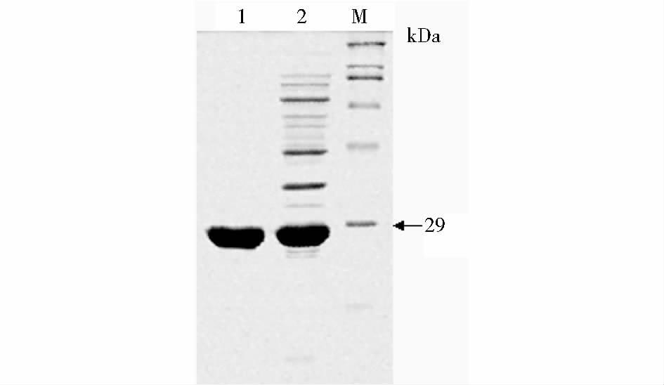 表达菌诱导后SDS-PAGE电泳显示,诱导6h后,可大量表达分子质量约为27kDa大小的蛋白质,菌体破碎后发现该蛋白质以可溶形式存在于超声上清液中,以超声上清液跑SDS-PAGE电泳,Western blot检测,结果该蛋白质与His单抗可以发生特异性反应(图 3)。纯化后蛋白质目的条带单一,大小正确(图 4)。