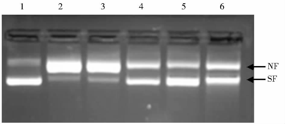 | 图 5 重组蛋白活性分析 Fig. 5 The activity analysis of recombinant protein1:The plasmid in a phosphate buffer;2:The plasmid with MCO system;3:The plasmid with BSA(0.2mg/ml) with MCO system as a control;4~6:The plasmid with recomninant Prdx6 protein(0.08mg/ml,0.16mg/ml,0.32mg/ml)with MCO system.NF:Nick form of the plasmid;SF:Supercoiled form of the plasmid |