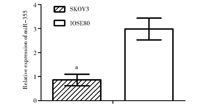 | 图 1 SKOV3及IOSE80中miR-335表达 Fig. 1 The expression of miR-335 in SKOV3 and IOSE80 Mean±SD, n=3, a:P<0.05, vs IOSE80 |