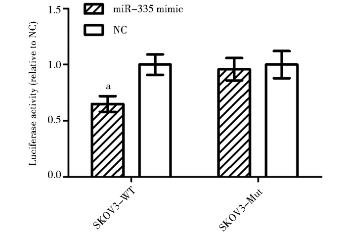 | 图 3 转染miR-335 mimic对SKOV3中miR-335表达的影响 Fig. 3 The expression of miR-335 in SKOV3 after transfected miR-335 mimic Mean±SD, n=3, a:P<0.05, vs negative control(NC) |