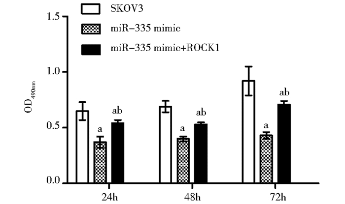 | 图 5 转染miR-335、ROCK1对SKOV3增殖活性的影响 Fig. 5 The effect of transfection miR-335 and ROCK1 on the proliferation of SKOV3 Mean±SD, n=3, a:P<0.05, vs SKOV3 group(negative control), b:P<0.05, vs miR-335 mimic group |
