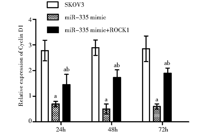 | 图 6 转染miR-335、ROCK1对Cyclin D1表达的影响 Fig. 6 The effect of transfection miR-335 and ROCK1 on the Cyclin D1 expression of SKOV3 Mean±SD, n=3, a:P<0.05, vs SKOV3 group(negative control), b:P<0.05, vs miR-335 mimic group |
